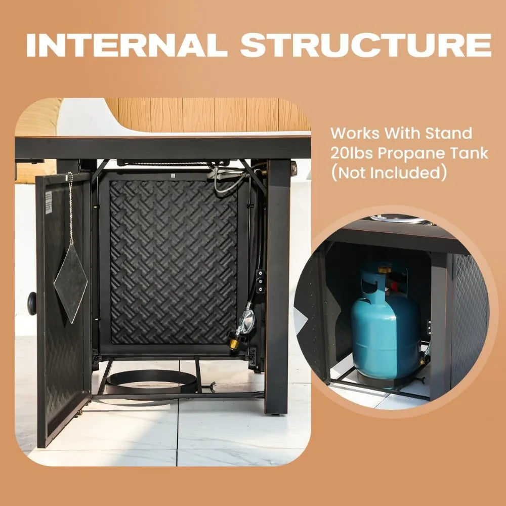 - 【Lasting & Smokeless Flame】 firepit table uses propane fuel to provide a green burn that is warm and smokeless, saving you from ashes and smoke.The side door panel can be easily opened to change and conceal the propane tank, work with a standard 20-pound propane tank (NOT INCLUDED),that can power 8+ hours of blaze.