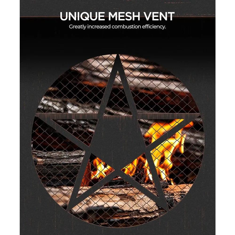 - Pentagram geometric cut-out adds visual appeal, enhances airflow, and creates captivating shadows as the flames dance.
