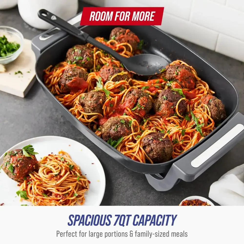Get all the benefits of a frying pan anywhere with an outlet—no stovetop required! From sausage and eggs for breakfast to grilled cheese for lunch or juicy steaks for dinner, this electric skillet makes everyday meals easier. Thanks to our diamond-infused ceramic nonstick, transferring and cleaning is seamless. Plus, our ceramic nonstick is PFAS-free so you can cook hassle-free and worry-free. The clear glass lid lets you watch your meal in progress without losing heat, while the spacious 7QT capacity delivers enough room for family-sized portions.