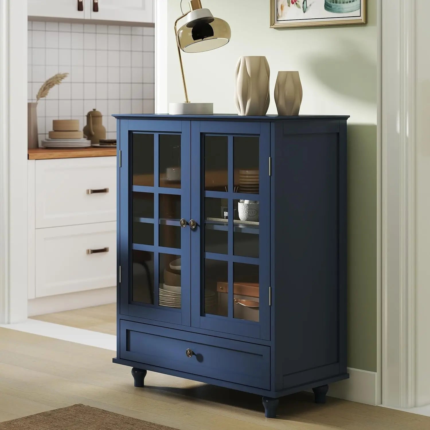 - Glass-door display showcases your serveware while protecting it from dust, so your dining area stays polished.