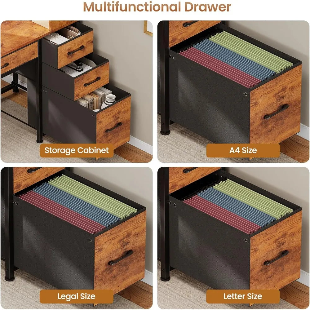 - Smart storage features 4 heavy-duty drawers, 1 file cabinet (Letter/A4/Legal), plus a 3-tier bookshelf and a hanging storage bag to conquer desk clutter.