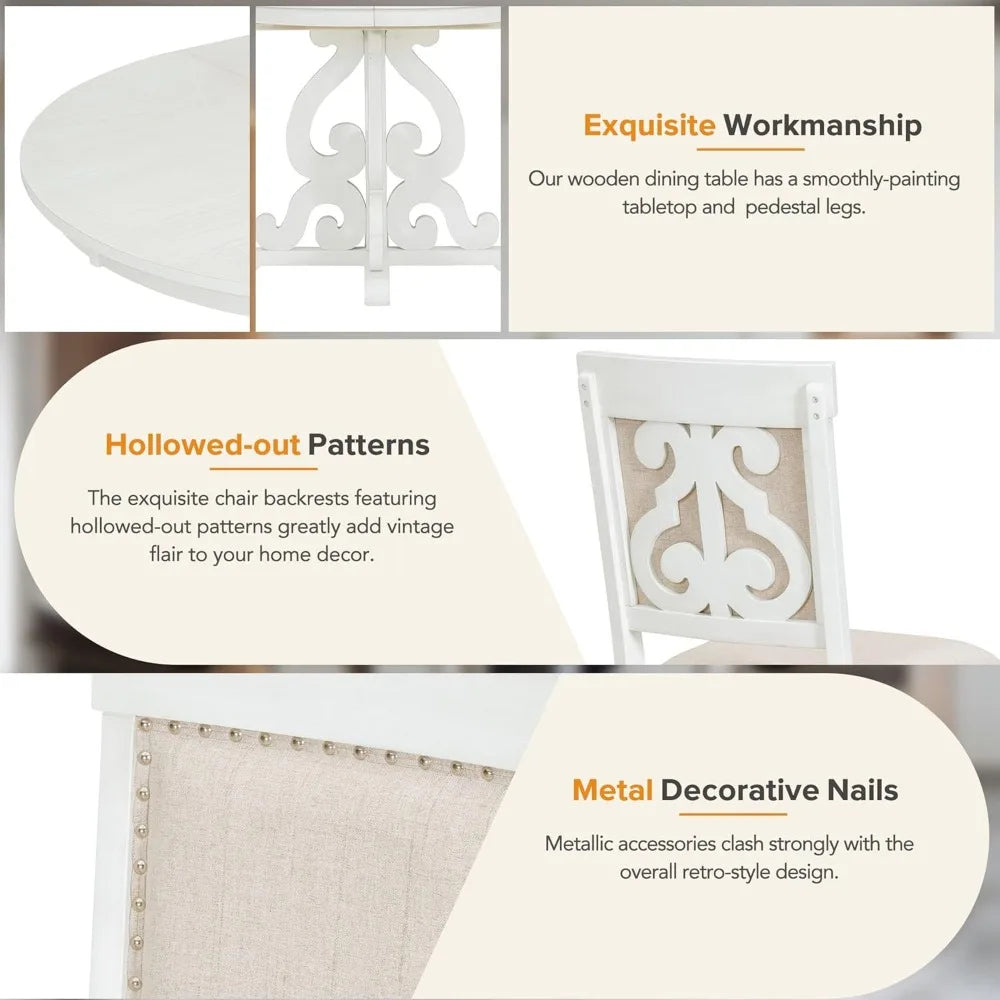 - [Retro Dining Table Set for 4] The retro feature dining table includes an expandable dining table and four matching upholstered chairs that mix understated elegance with a rich retro feel. The legs and backrest of the tables and chairs are made of symmetrical hollow carving patterns. It is available in two colors, antique white and walnut. No matter which color of cutlery you choose, it will be the finishing touch of your dining room, kitchen or dining room.