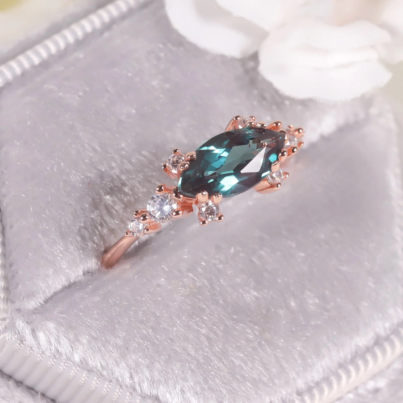 Turn every glance into admiration with the GEM'S BALLET 14K Rose Gold 925 Sterling Silver Marquise Cut 5x10mm Color Changing Alexandrite Engagement Ring — a striking, romantic statement that celebrates June birthdays and timeless devotion.